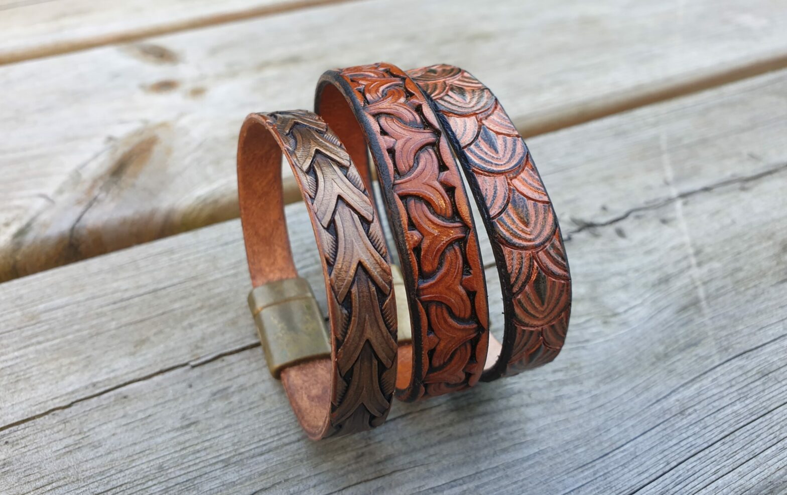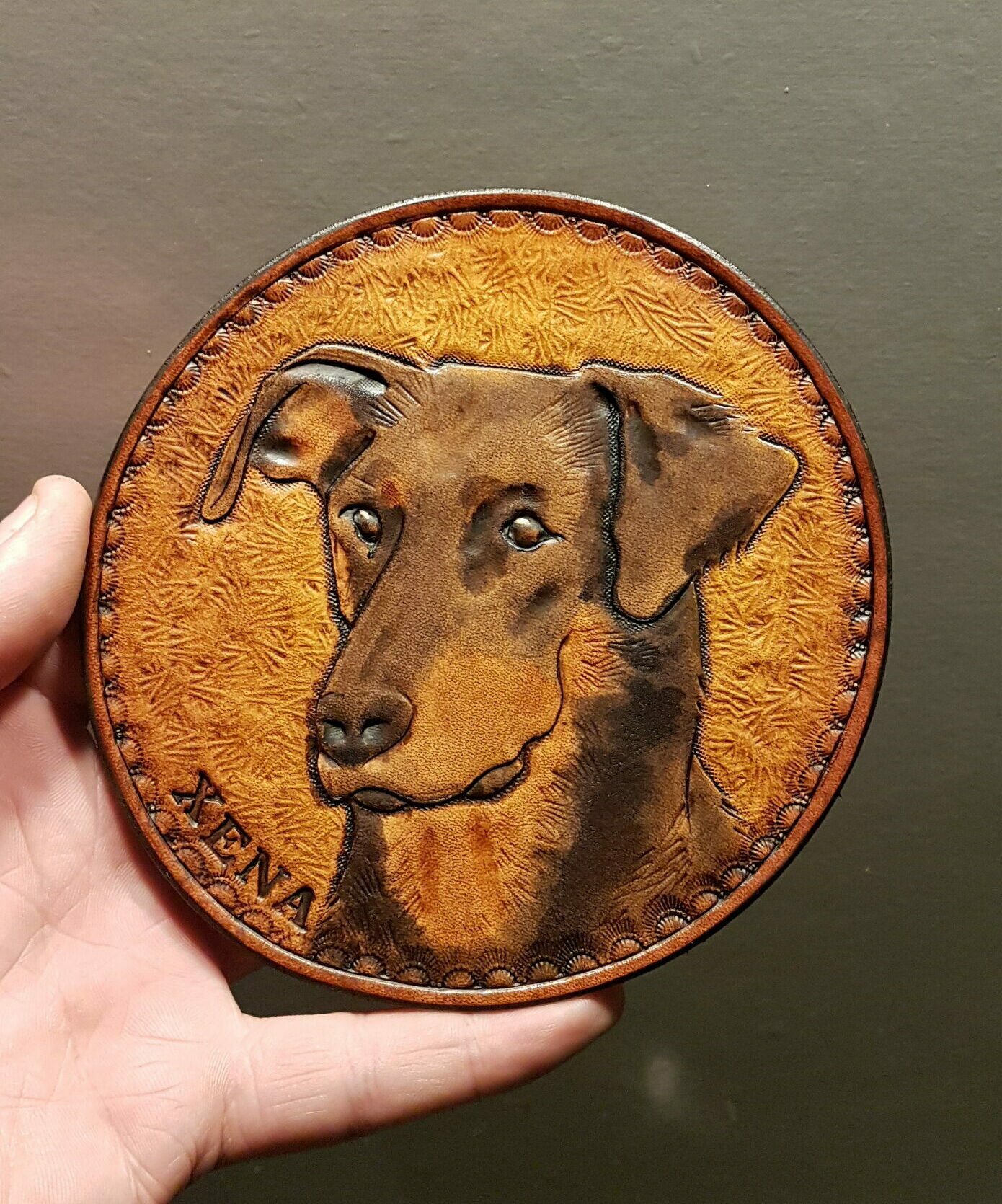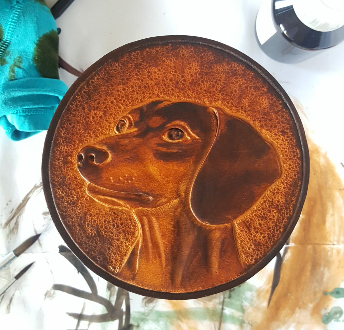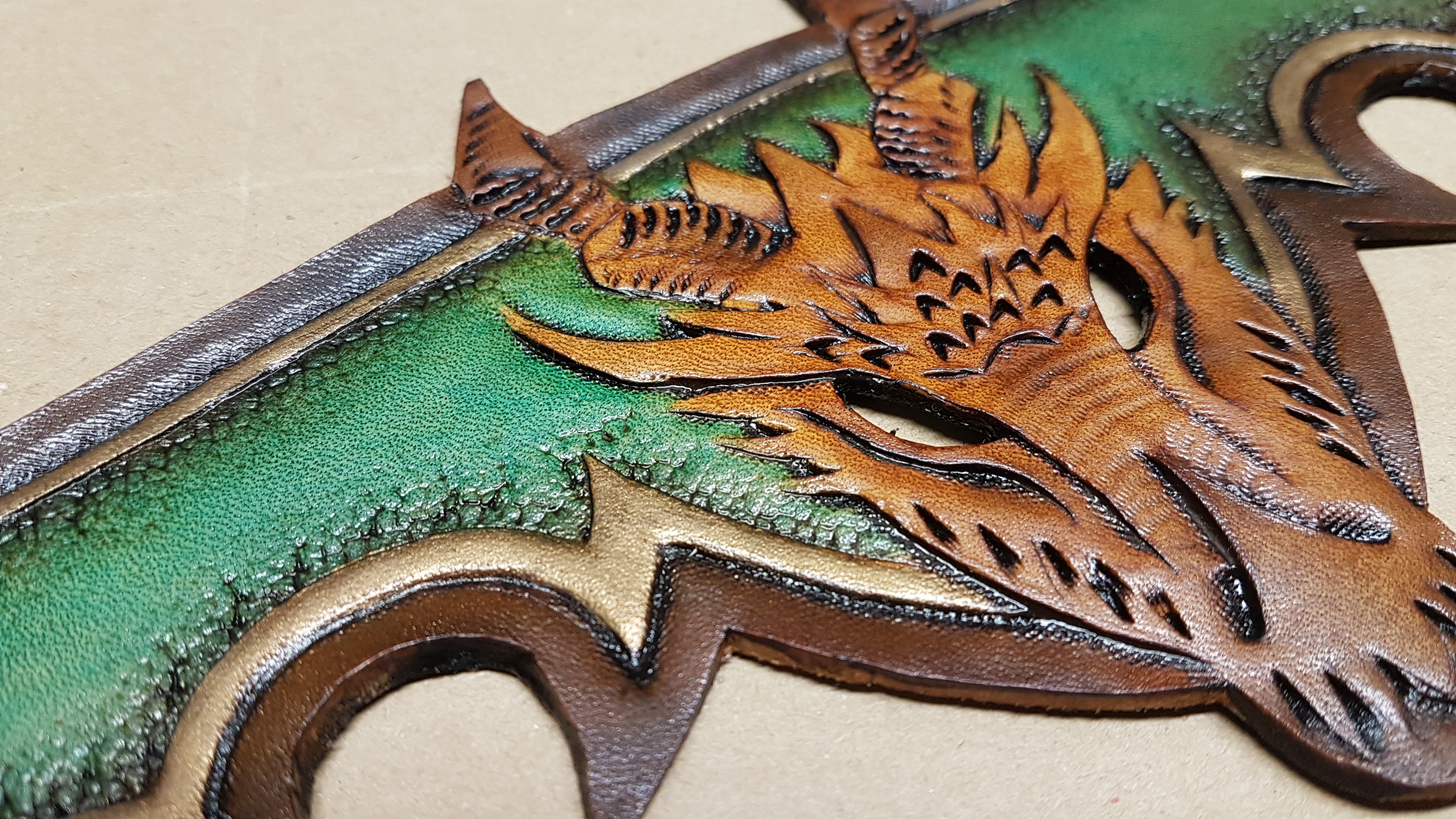 Réalisation en cuir tannage végétal, repoussé, teinté et peint.