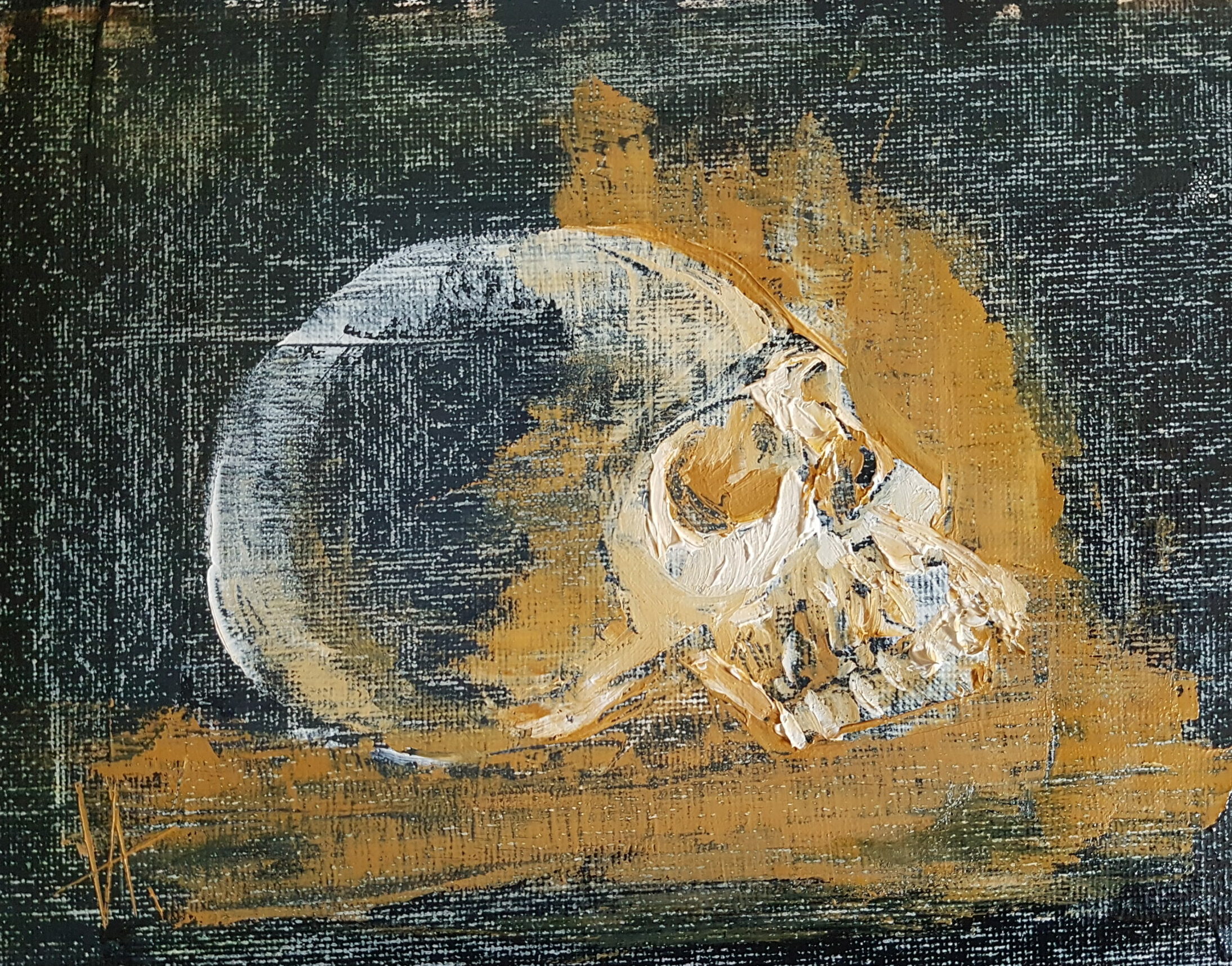 Ratage spontanément recouvert par un crane. Peinture à l’huile appliqué à la spatule sur carton entoilé.