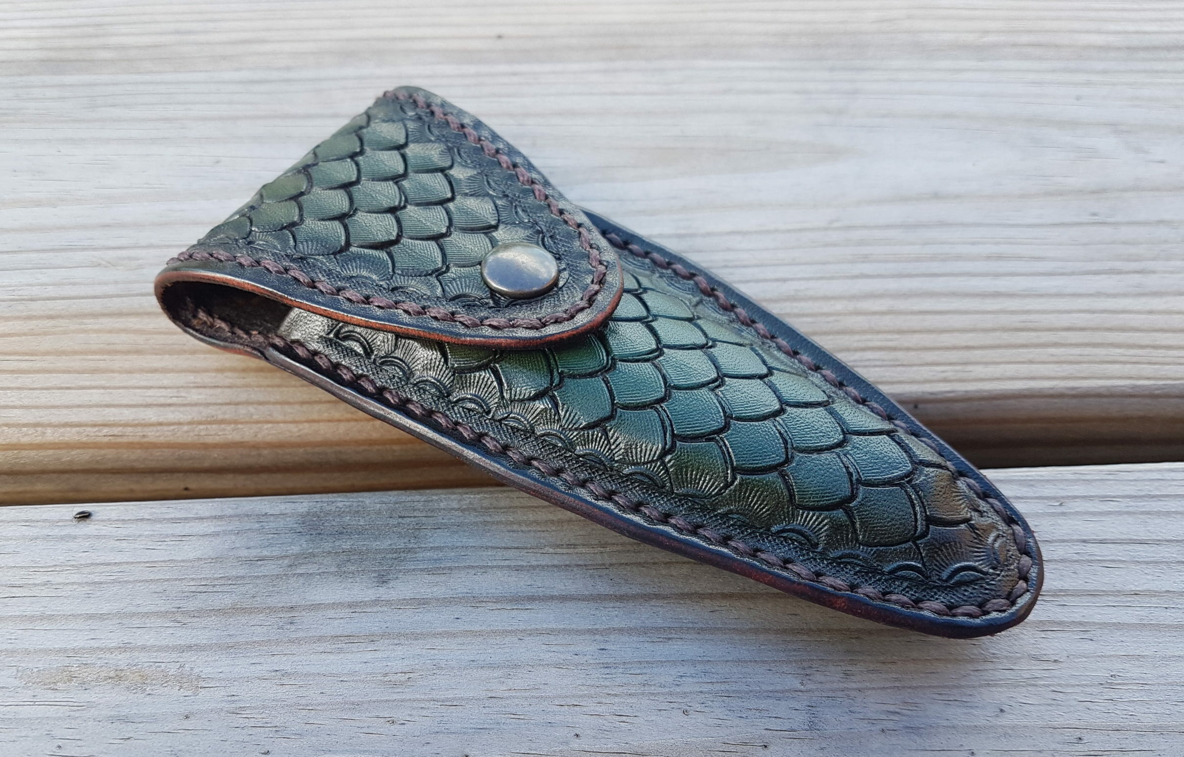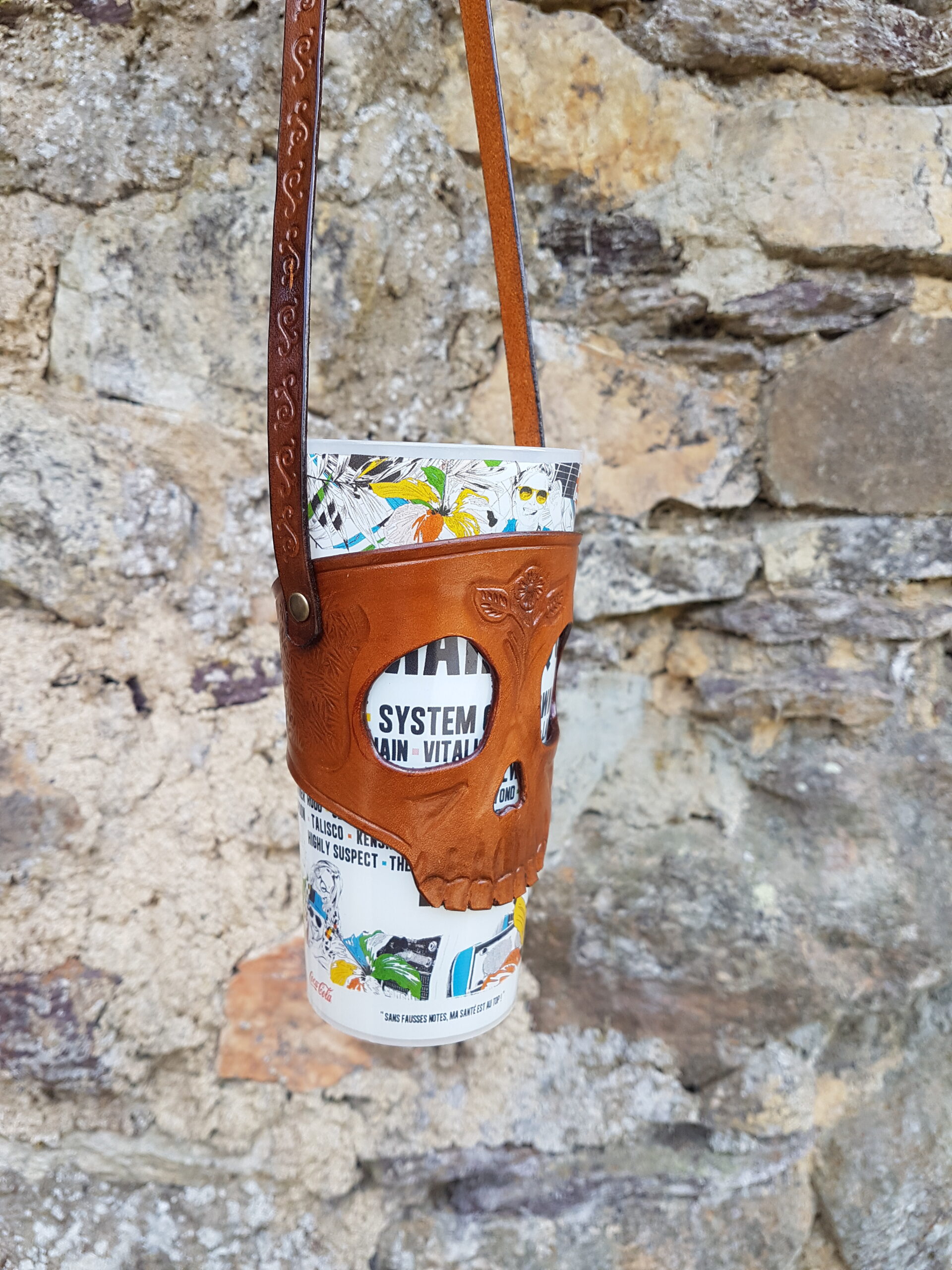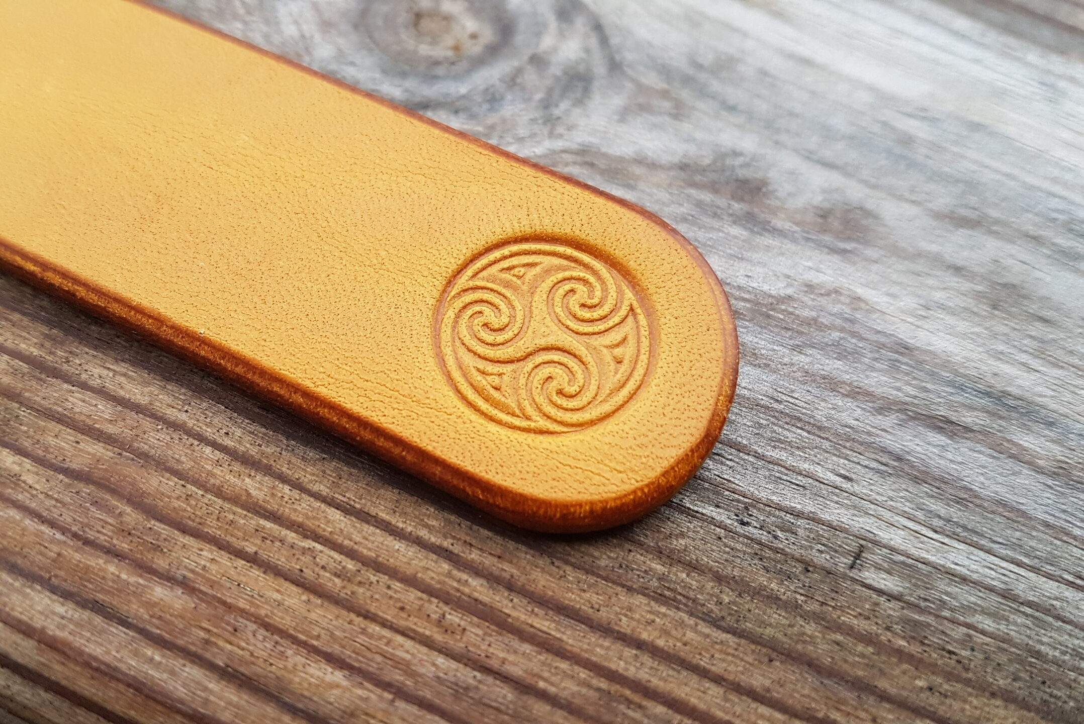 Réalisé en cuir tannage végétal teinté et repoussé. Assemblé avec une couture à la main en point de sellier.