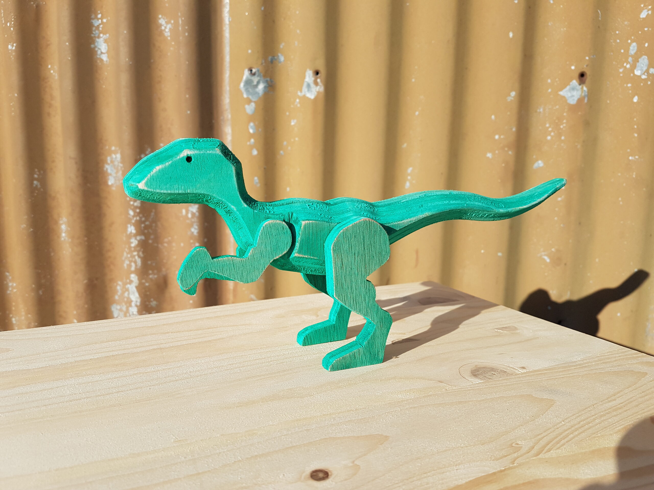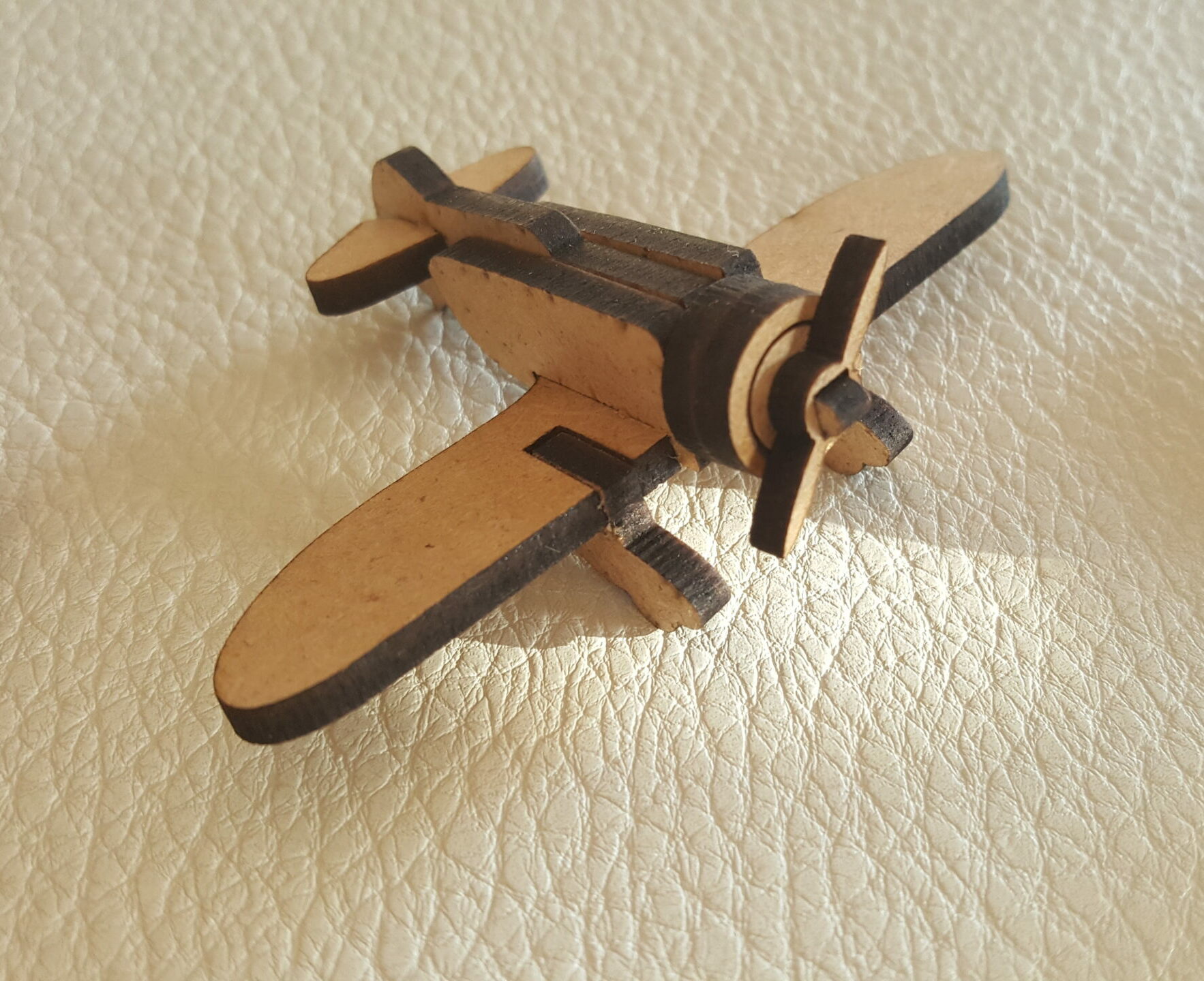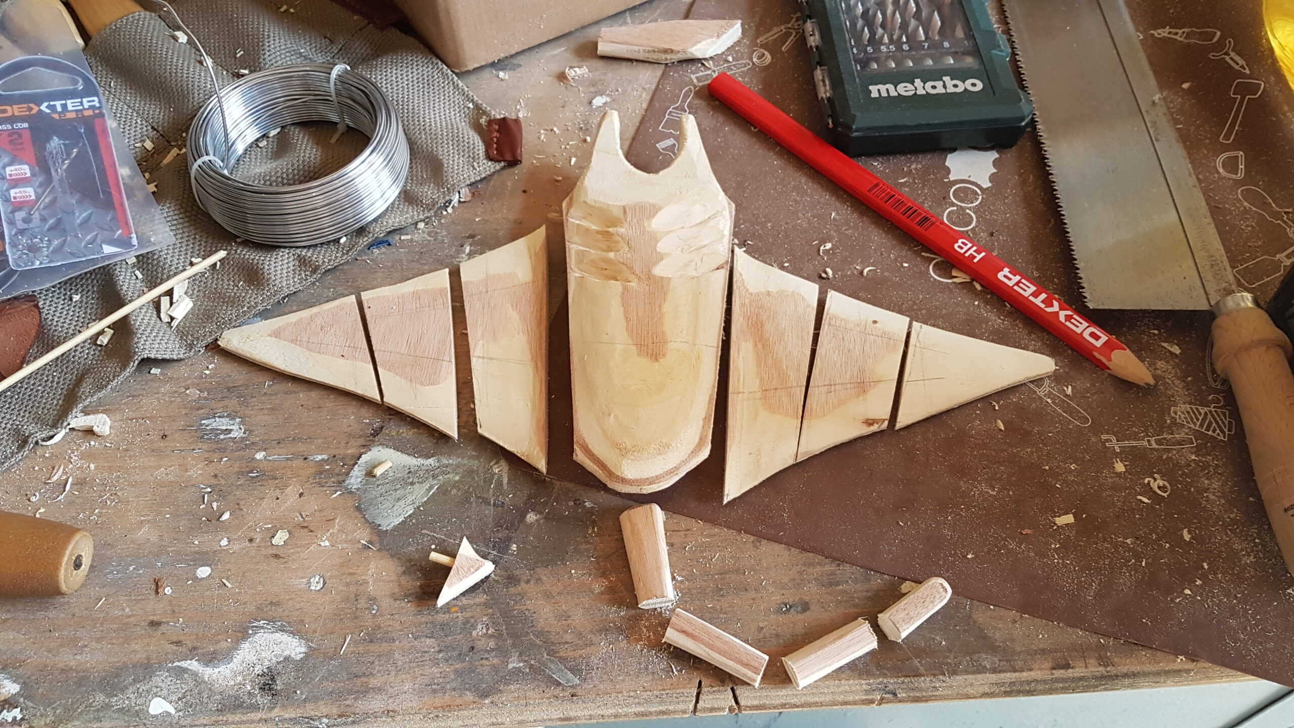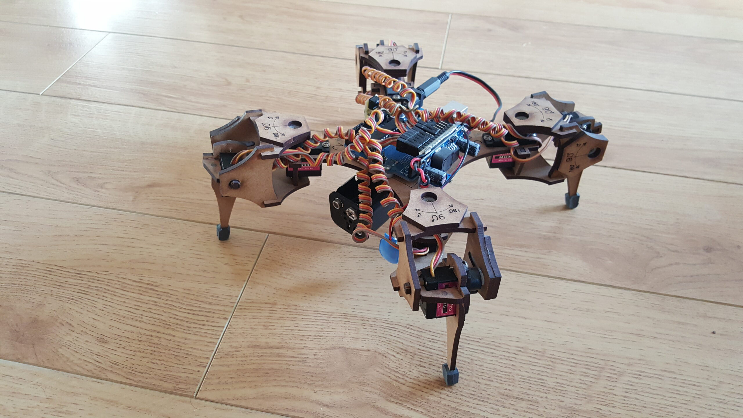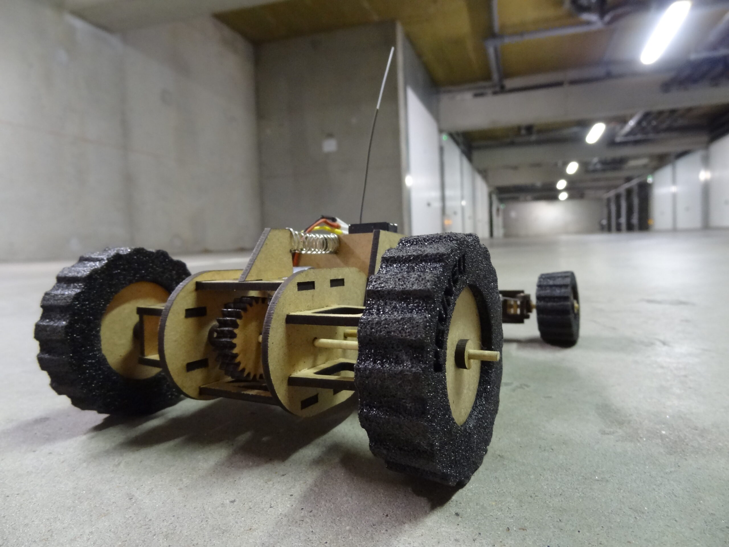 Du mdf 3mm découpé au laser, des pics à brochette, un peu d’électronique RC et un ressort. Les engrenages sont en bois et les roues…