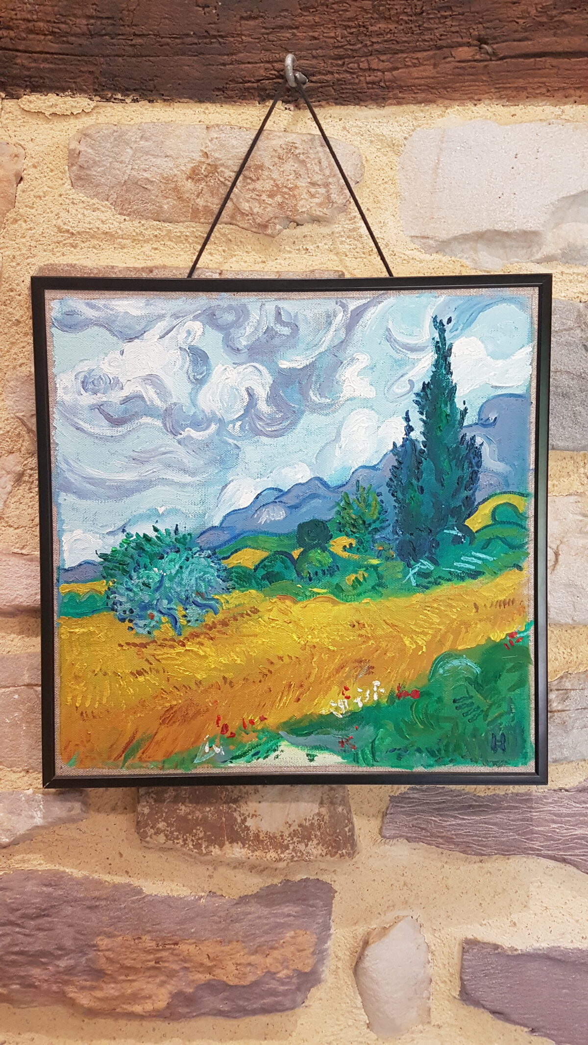 Très librement inspiré par le célèbre tableau « Champ de blé avec cyprès » de Vincent Van Gogh. Loin…. même trèèèèèèèèèèèèèès loin d’égaler l’original, je suis quand…